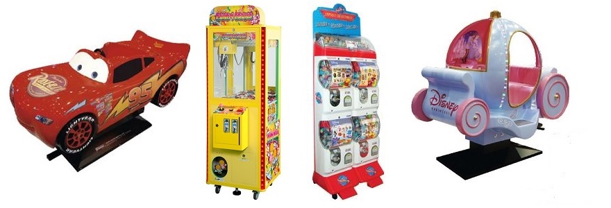 Vi ställer ut godiskranar, åkattraktioner, gachaautomater och tuggummiautomater.